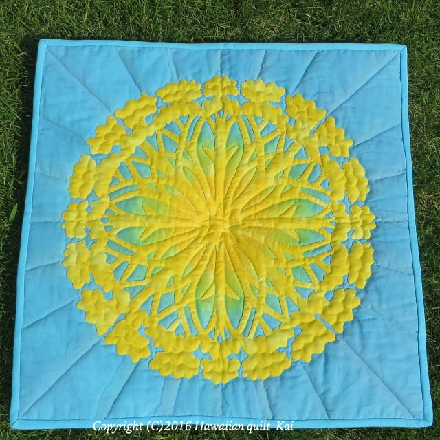 青い空に黄色の花の風景をそのまま切り取ってハワイアンキルトに仕上げました。