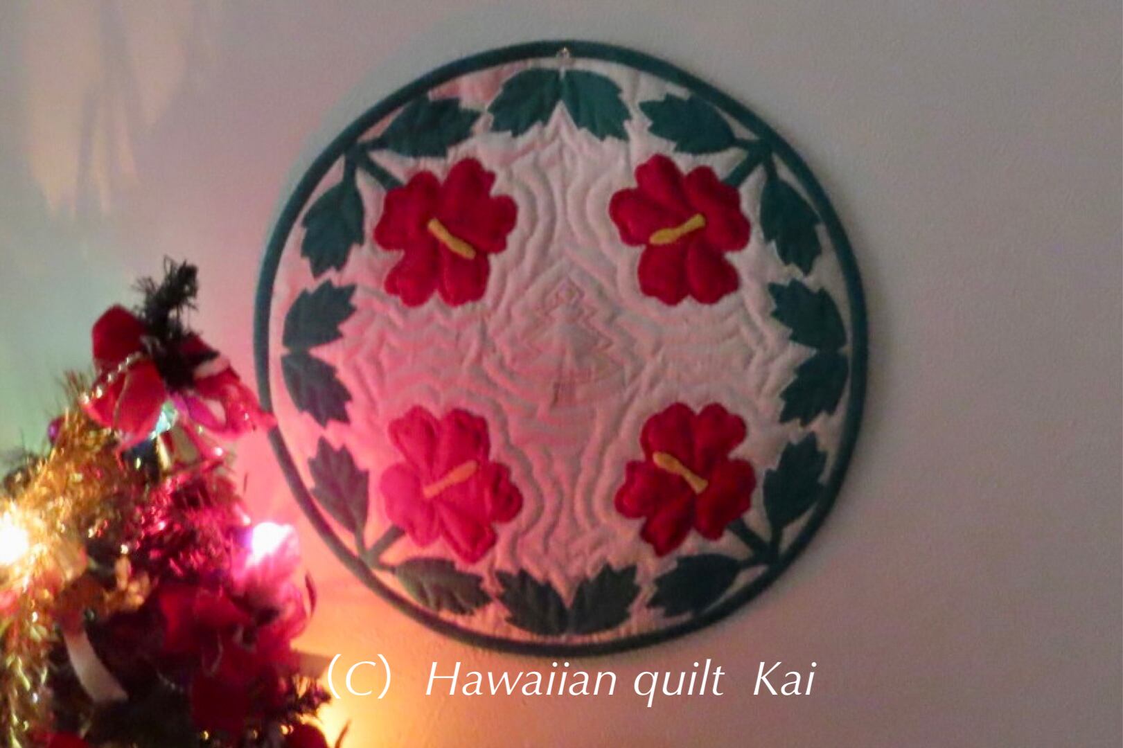 ハワイアンキルトで親しまれている植物、ハイビスカスをモチーフに、これからやってくるクリスマスを待つ温かい気持ちを表現しました。